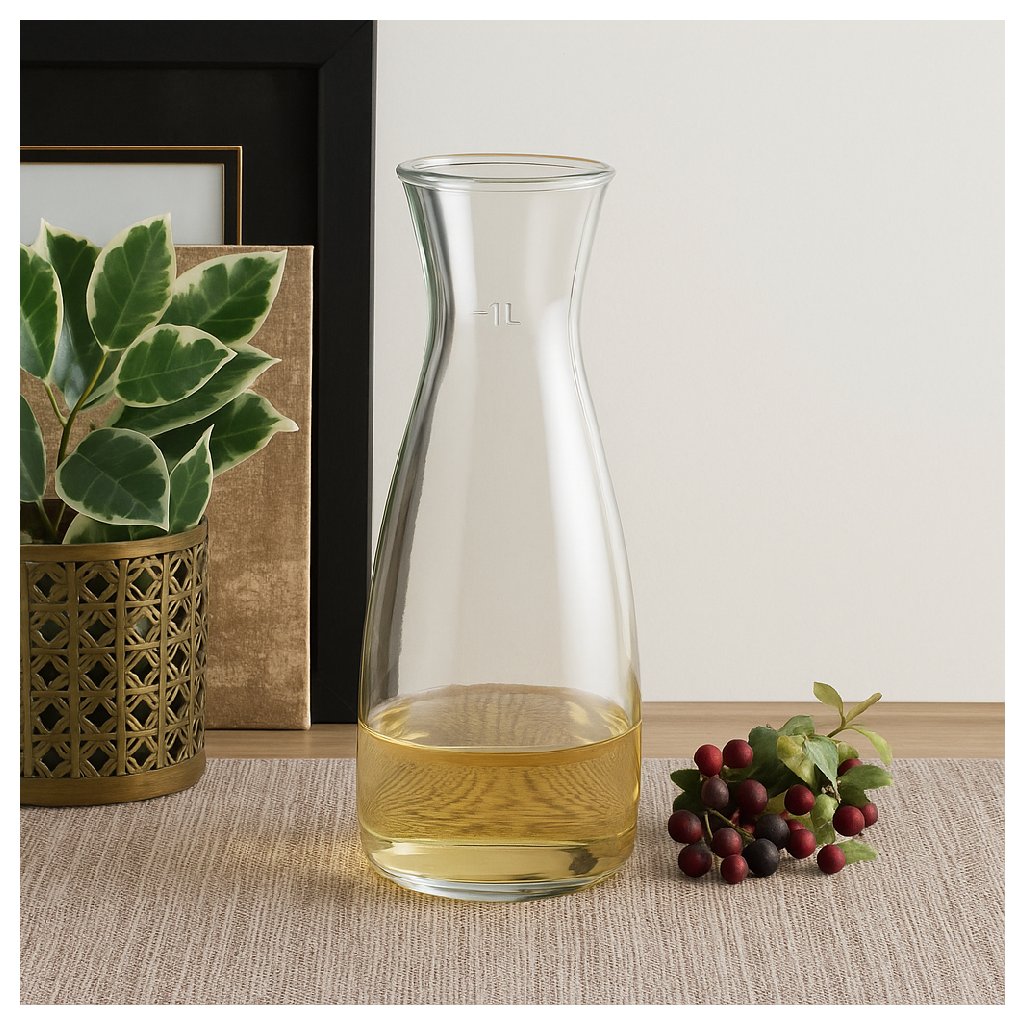 Štíhla a nadčasová. Sklenená karafa s objemom 1 liter (6 ks) je ako stvorená na podávanie osviežujúcich nápojov — či už ide o ovocné džúsy, citronády alebo pokojne čistú vodu — v domácom prostredí aj v elegantnej gastronomickej prevádzke.